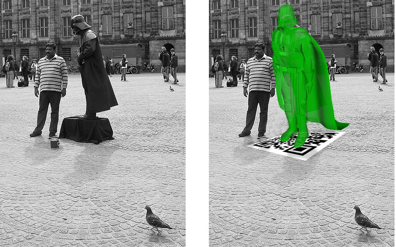 Even though they have nothing to do with the city of Amsterdam, people go and have their picture taken with them on and off. But not on the 24th of April! Then, the majority of people will be photographing the empty space beside Darth. Because that space will be occupied by virtual 'human sculptures', brought alive by Augmented Reality applications on iPhones and Android devices! JOIN the flashmob on saturday the 24th around 14h. Prepare your phone, install the right Augmented Reality software, choose your favorite character and contribute it to the pool of virtual 'human sculptures' on the Dam square. >>> INSTRUCTIONS
