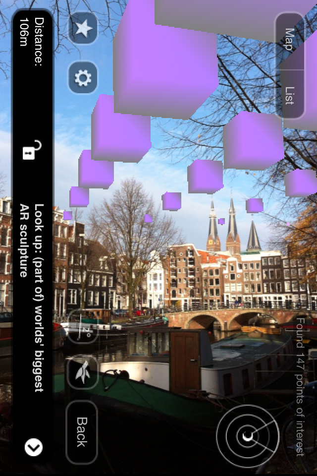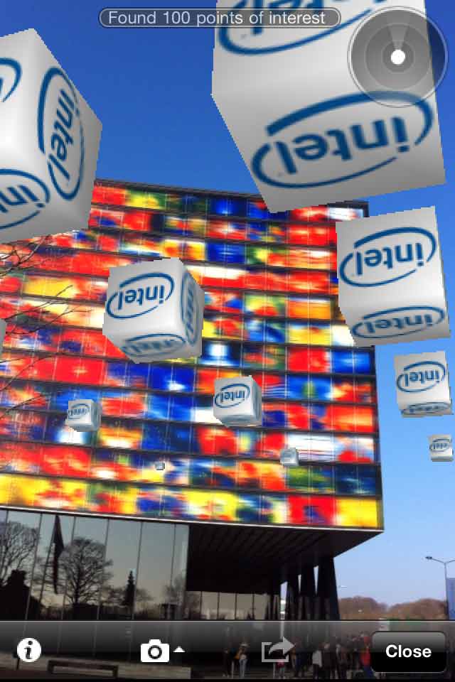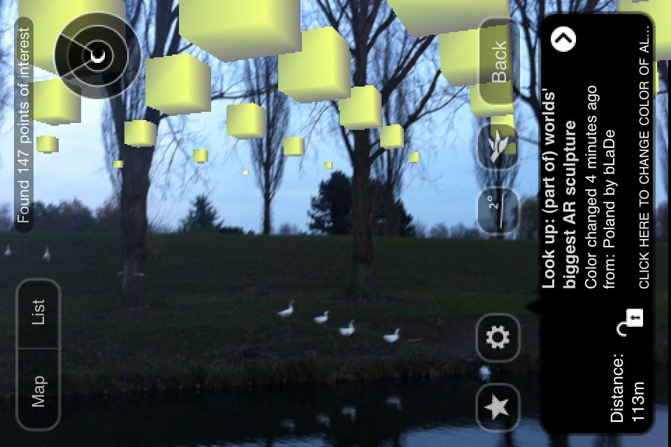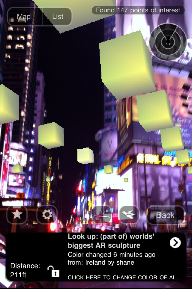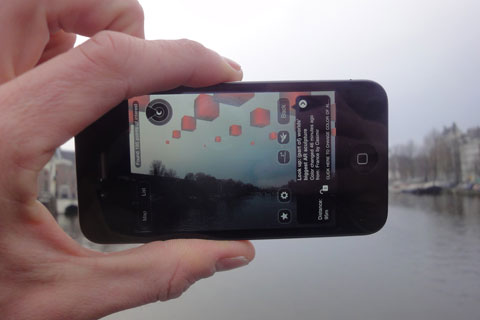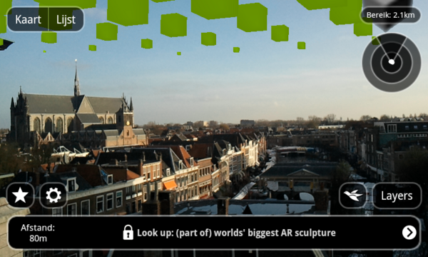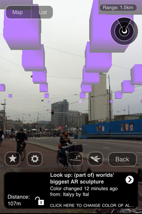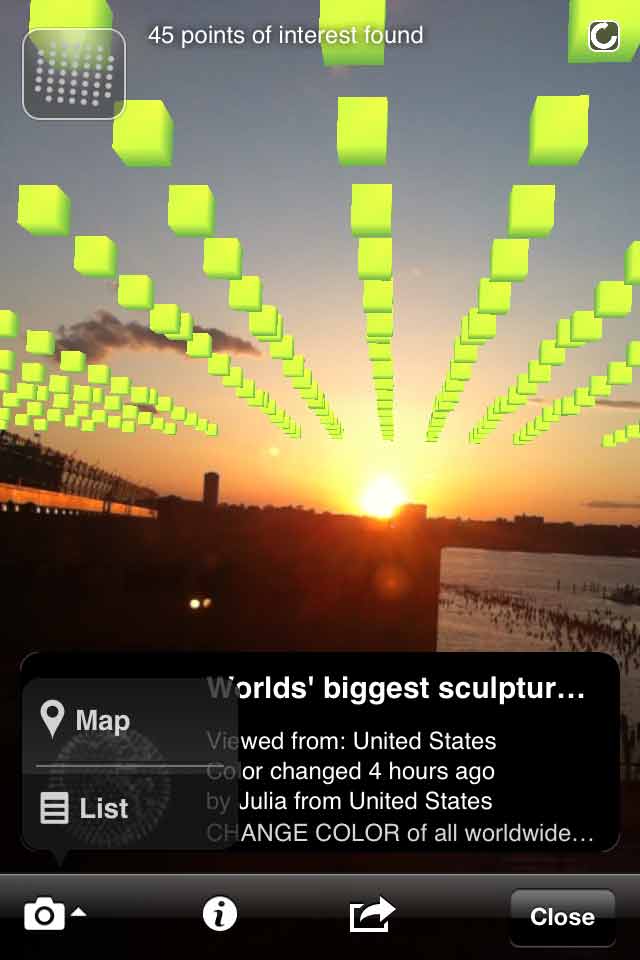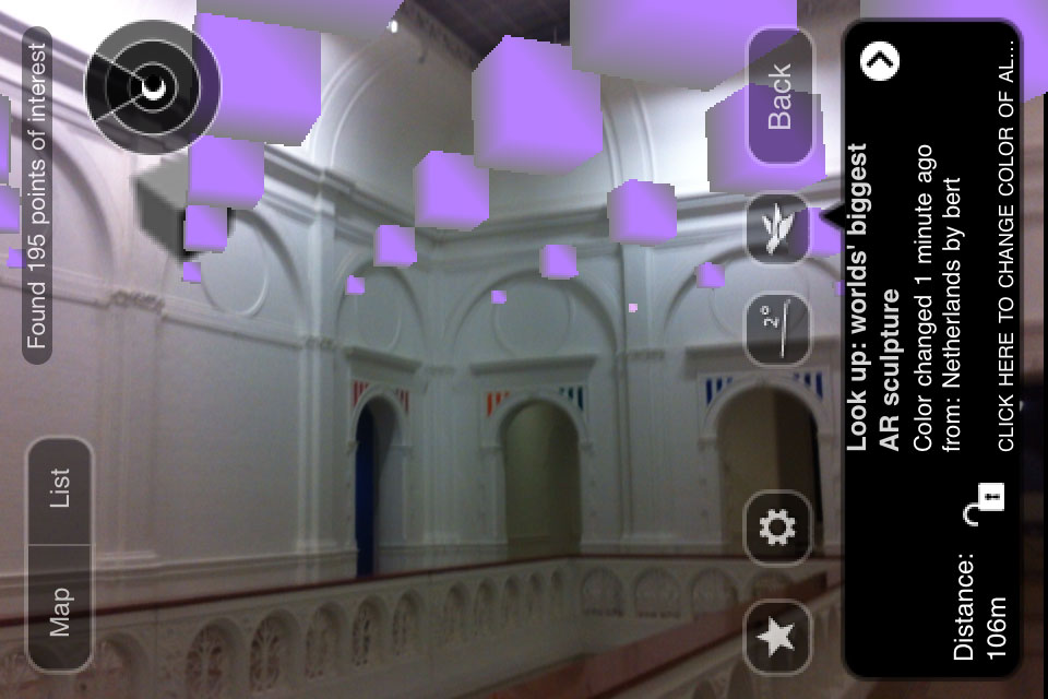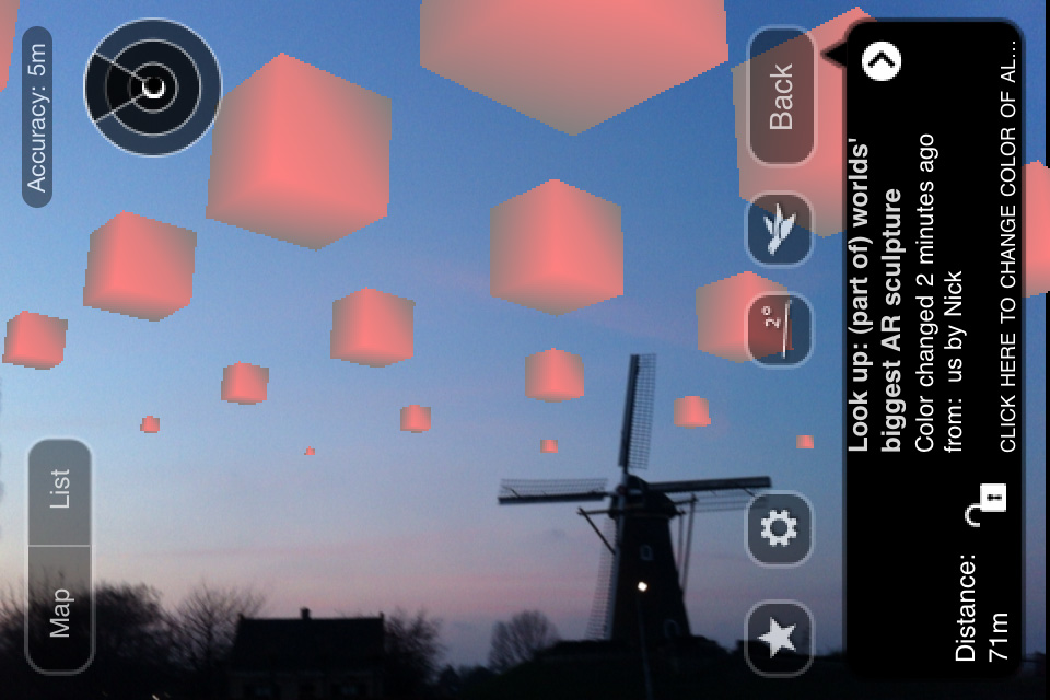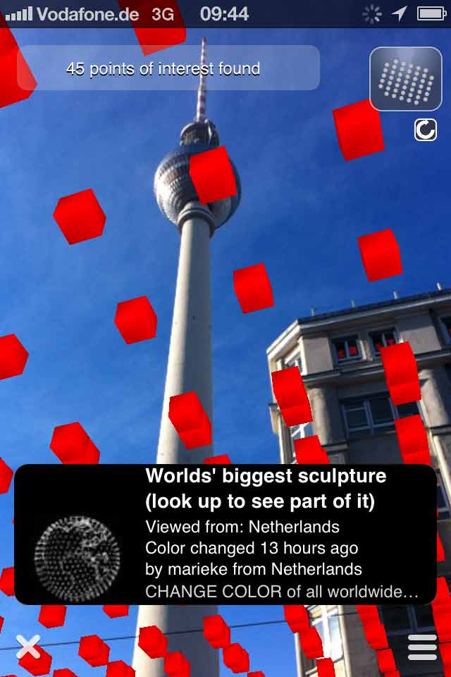 At any location anywhere in the world a section of the 7.463.185.678 cubes can be viewed in the sky using the Layar AR browser for iPhone 3GS/4 or Android smartphones: